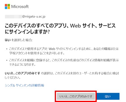 まず、今ログインしているアカウントから一度ログアウトし、新潟大学のMicrosoft アカウントでログインしてください。